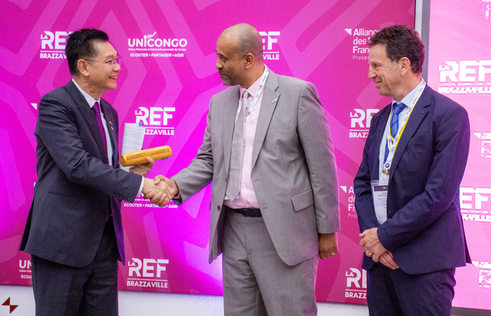 Enfin, la passation symbolique du flambeau de la REF s’est déroulée entre le Président Michel Djombo, le Président Geoffroy Roux de Bézieux et Sovanna Sun, Secrétaire d’État du Cambodge chargé de la Francophonie.